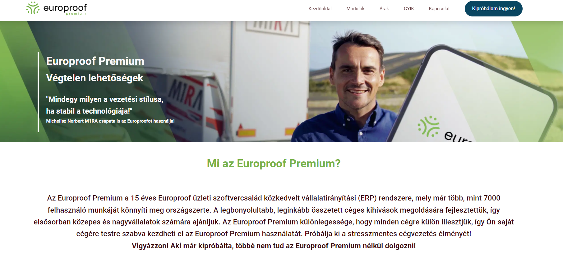 Saját vállalatirányítási rendszerünk bemutatását hivatott szolgálni a weboldal, amely informatív és figyelemfelkeltő stílusban készült. A figyelemfelkeltés céljából a „több kép és kevés szöveg” mintát követi, ezzel is kedvezve az oldalra látogatóknak. Célunk az volt, hogy bemutassuk, mi is az az Europroof termékcsalád, és hogy milyen szoftverek részei ennek a vállalatirányítási rendszer. A weboldal technológiai hátterét a Plaveoo saját fejlesztésű CMS tartalomkezelő rendszere biztosítja, ez teszi lehetővé az egyszerű szerkesztést és naprakész információk feltöltését.